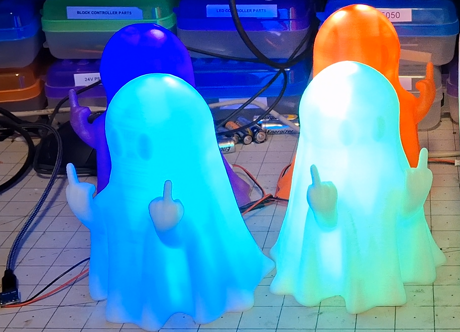 So now I have a "decapitated" ghost. The first full size fail. Let's try the blue. At least this time when it ran out, I was ready to swap in the new spool, but it's obvious they're two different filaments. Bummer. One full size homogenous blue coming up. Sucess. Time to swap in the new glow in the dark green spool and kick off a full size print. While all this is going on, I'm prototyping the UV LED guts for the full size purple ghost.
