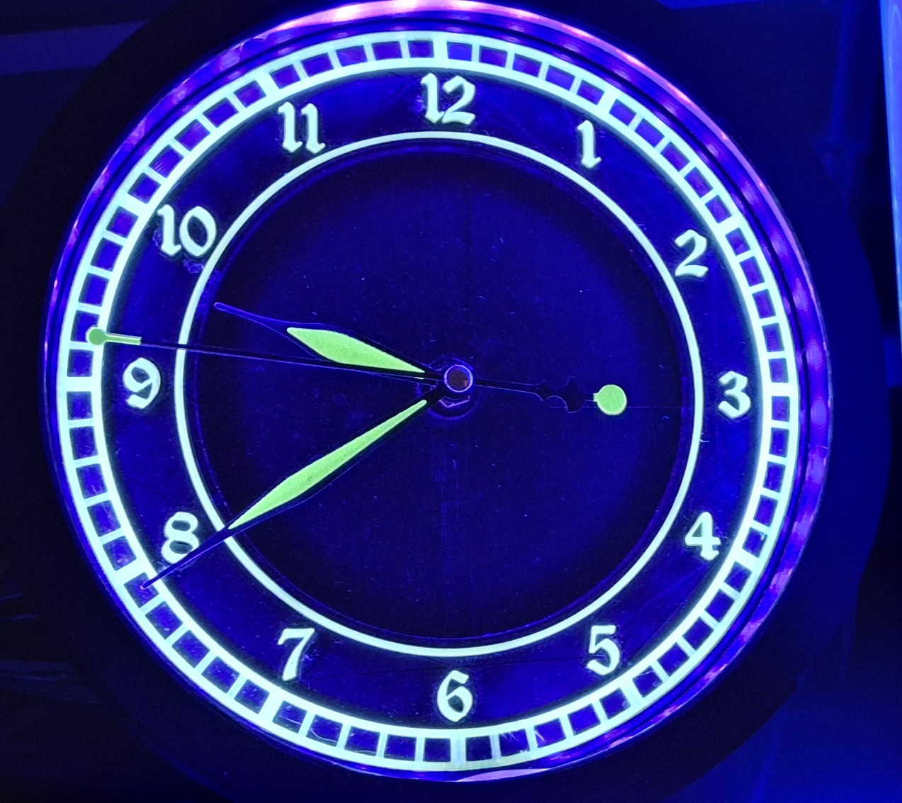 Back when I bought my first 3D printer, my first venture into ultraviolet (UV) light emitting diodes (LEDs) was my “Glow In The Day” clock project. I’ll save the details for later in the post, but like any prototype, mistakes were made. One was printing it way too thin, the plastic face splitting into a flap where the clock movement is mounted. More pertinent to this discussion was the selection of outdoor, 12 volt UV LED strips.