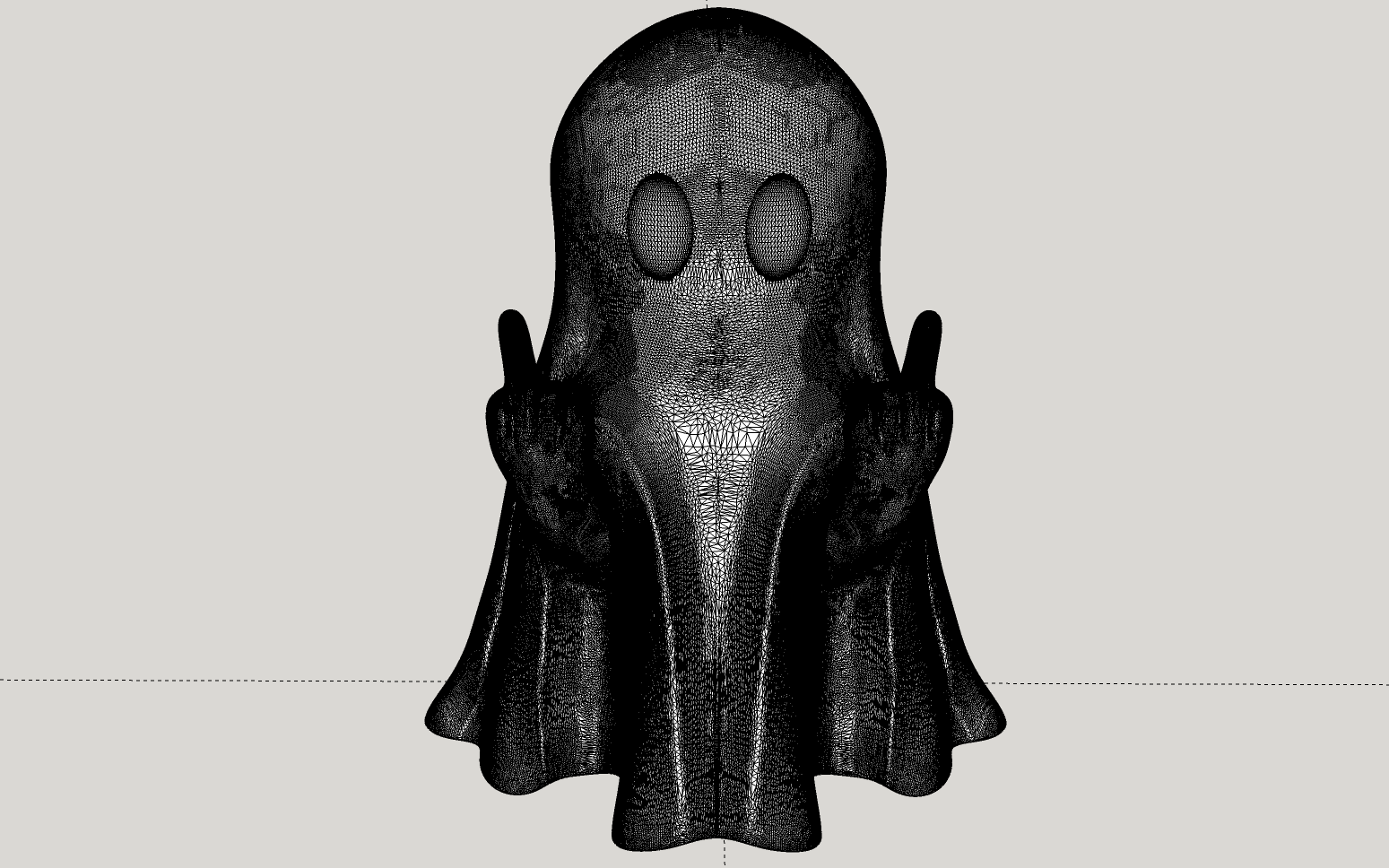 Having those glowing skulls sitting on top of the speakers on either side of my desk got me thinking about what else I could do with the glow in the dark 3D printer filament and some UV LEDs. Nick and I were chatting on Slack one night and he sent me a picture of a plastic ghost flipping me the bird, from an ad, that said it was supposedly holding candles. If I try hard enough, I can convince myself those might be candles, but always saw it flipping me the bird first.