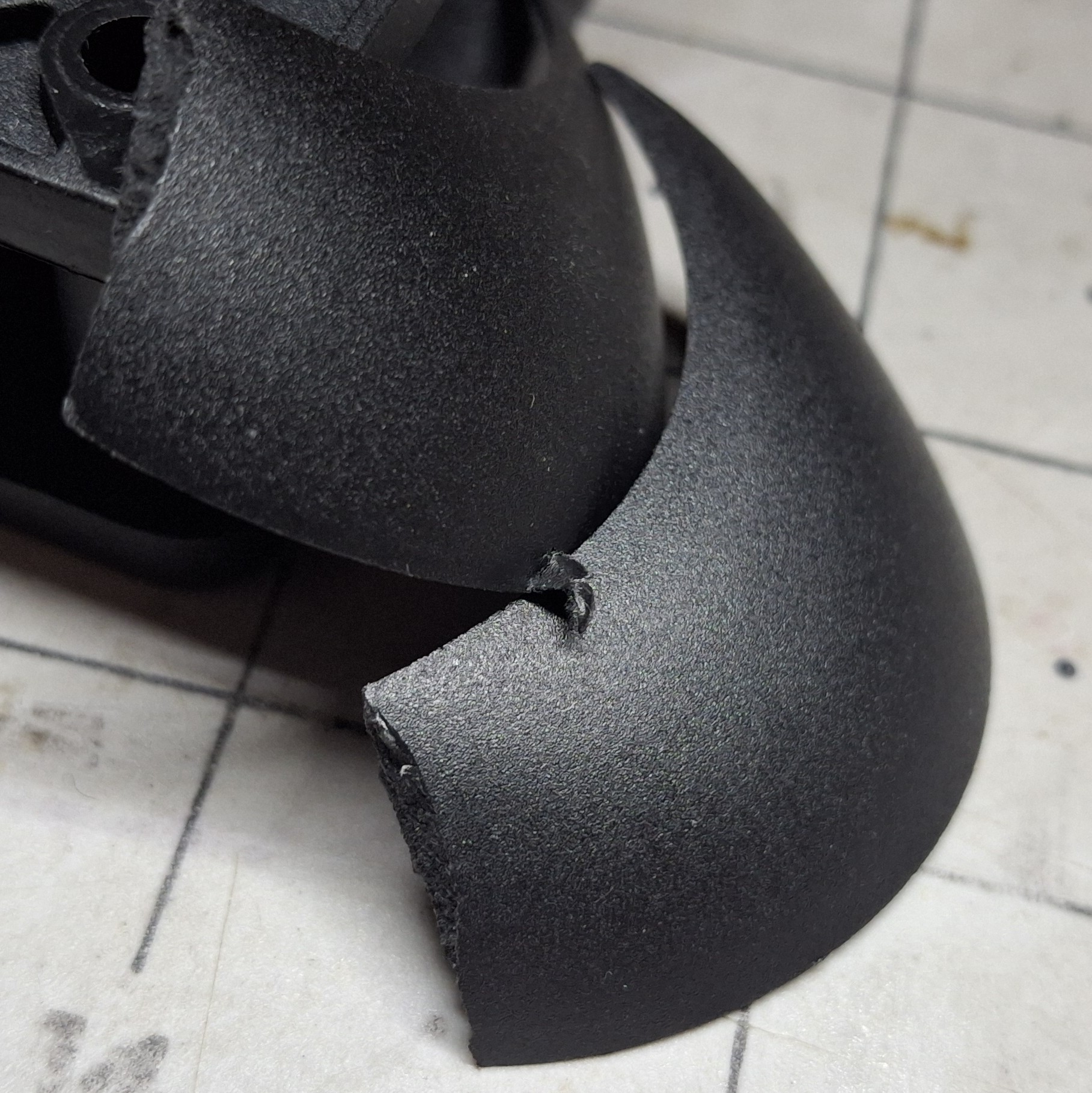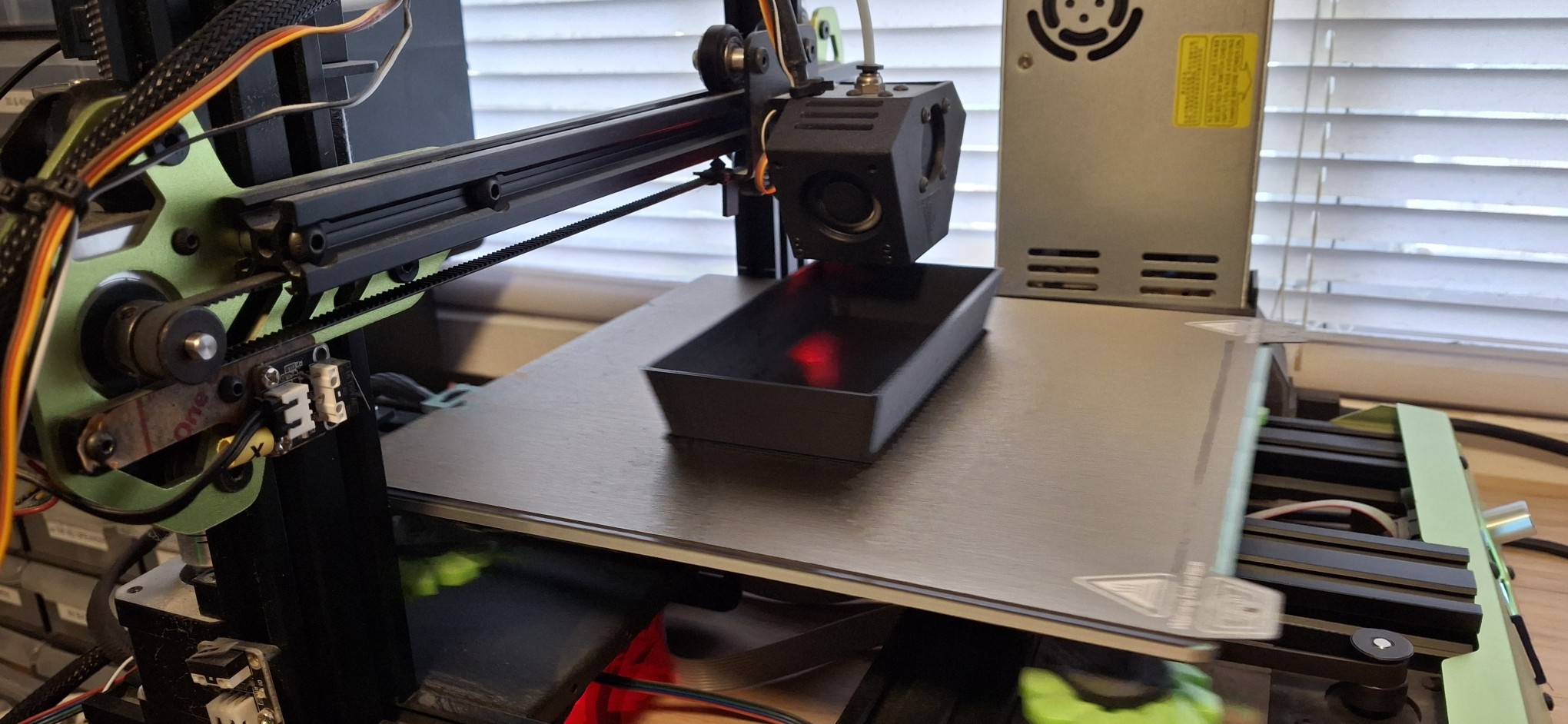 With what’s left of the glow in the dark green still loaded in the old printer, I kicked off a full sized print, convinced there was enough filament to complete the job. I stayed up past midnight, checking there was still enough filament left, thinking I’d just pause the print if it ran out and swap in the new spool sitting on the shelf. There’s also a new spool of blue next to it. Thinking I could keep checking on it, I dozed off. Big mistake.