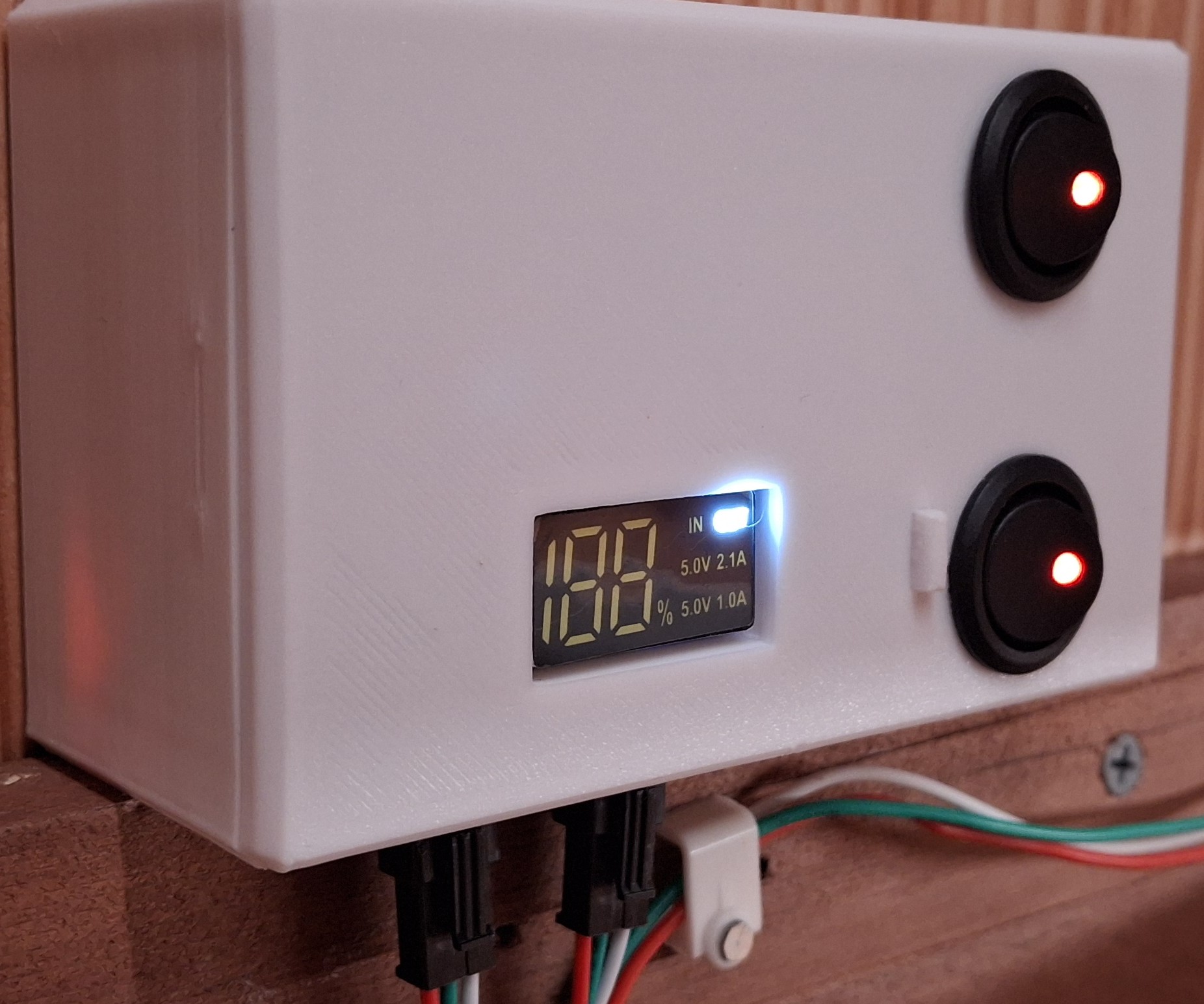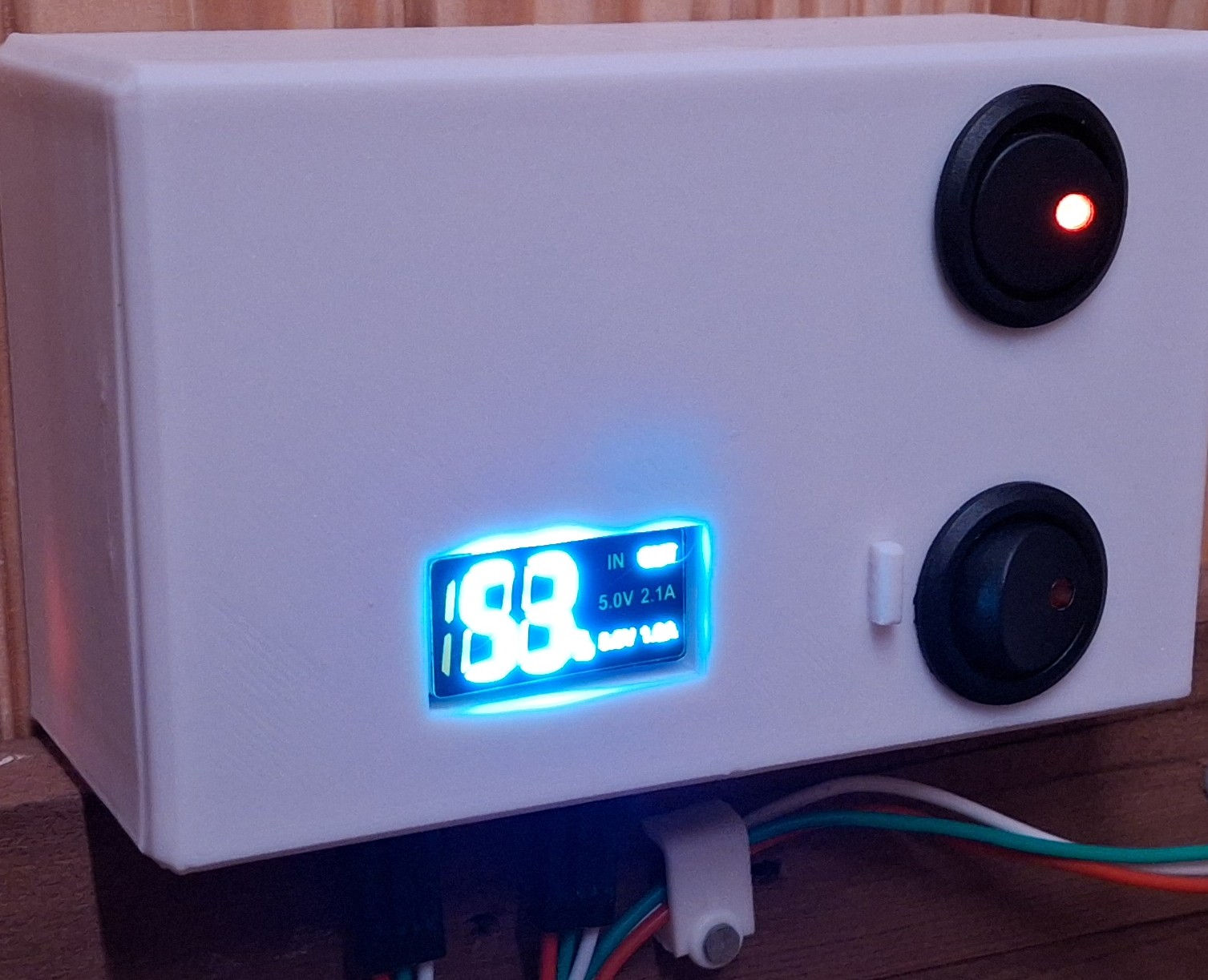 Three things became readily apparent. First, 40 LEDs draw a significant amount of power, regardless of supply voltage. Each LED draws about 20mA, times 40 is 800mA. The boost converter is rated for 2A, but supplying anywhere near the maximum power to the LED strip, the color changes from the familiar UV purple to nearly bright yellow? Not sure what that’s all about. Could be related to the outdoor silicone coating or the LEDs themselves.
