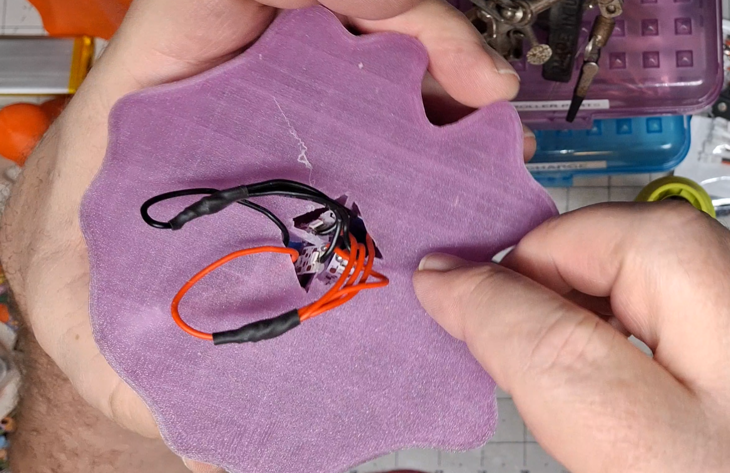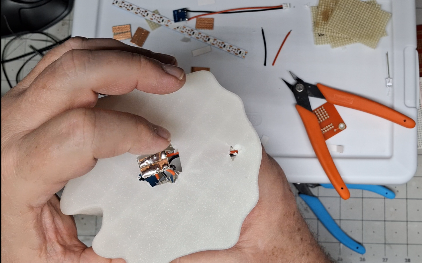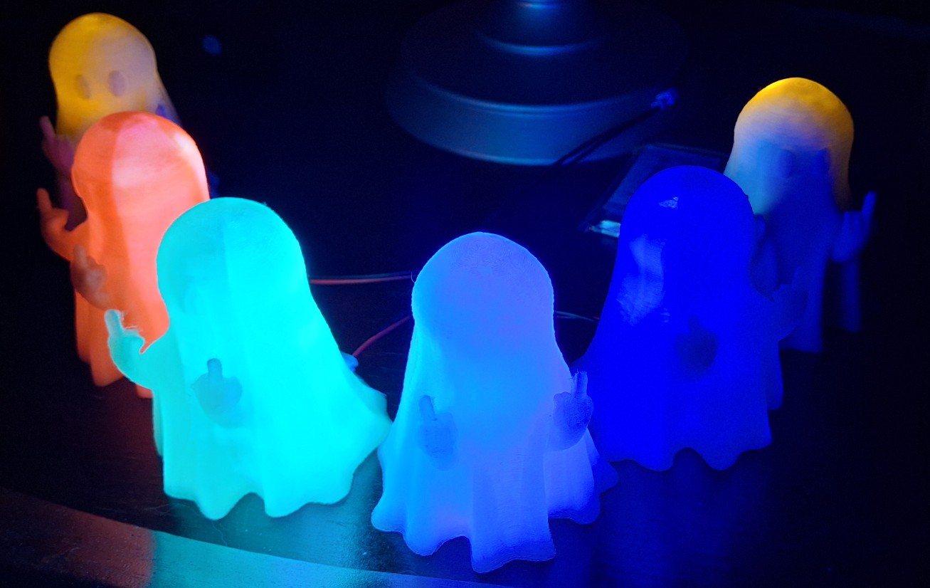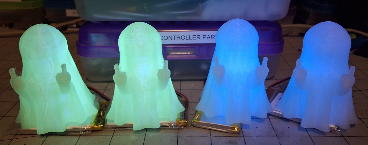 So now I have a "decapitated" ghost. The first full size fail. Let's try the blue. At least this time when it ran out, I was ready to swap in the new spool, but it's obvious they're two different filaments. Bummer. One full size homogenous blue coming up. Sucess. Time to swap in the new glow in the dark green spool and kick off a full size print. While all this is going on, I'm prototyping the UV LED guts for the full size purple ghost.