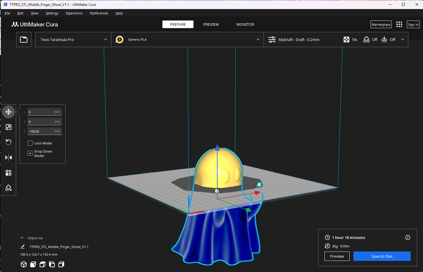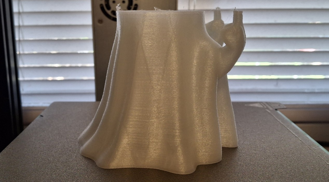 When Nick and I were discussing my luck with Nate, the decapitated ghost, he told me I should be able to just drop all but the part that didn't print beneath the build plate and the slicer should only print what's above it. Time to fix Nate and give him back his head (and "amputated" fingers). Then plan is to glue them back on. So now we'll have two mismatched, full sized ghosts.