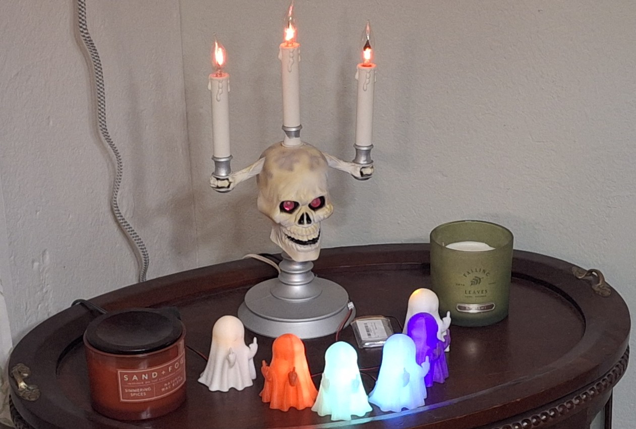 Meanwhile, Nick had sent me a picture of a ghost supposedly holding candles, but the ghost is really flipping me off. If I force myself to see candles, then maybe, but I always see flipping the bird first. Then I saw the identical picture in my inbox from one of those Chinesium sites. I joked with Nick about how we could use an old white sheet and 3D print some "candles" to make our own out of the skeleton candelabra. He found someone actually made an STL file and sent it to me!