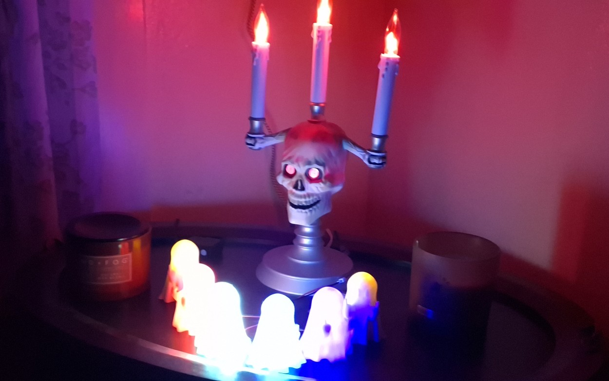 What started out as a desire to update the closet lighting test fixture with Halloween colors turned into an all out Halloween decoration passion. Bored, I was able to figure out the colors while sitting in a meeting. The rest kind of just happened, starting with getting the Halloween decorations down from the attic. We've had the skeleton candelabra for years, and the bulb in the skull finally burned out. We'd already replaced the neon flicker bulbs over the years as they wore out.