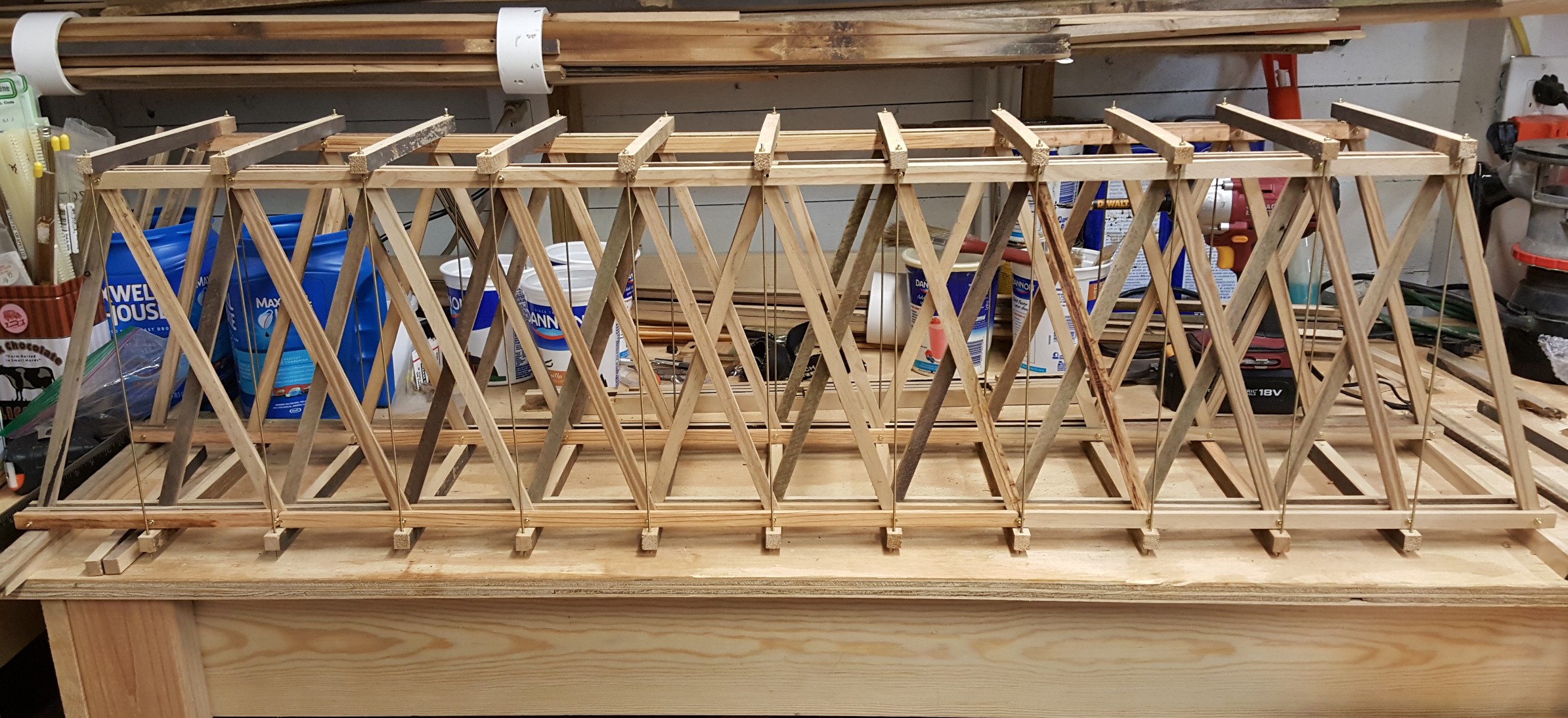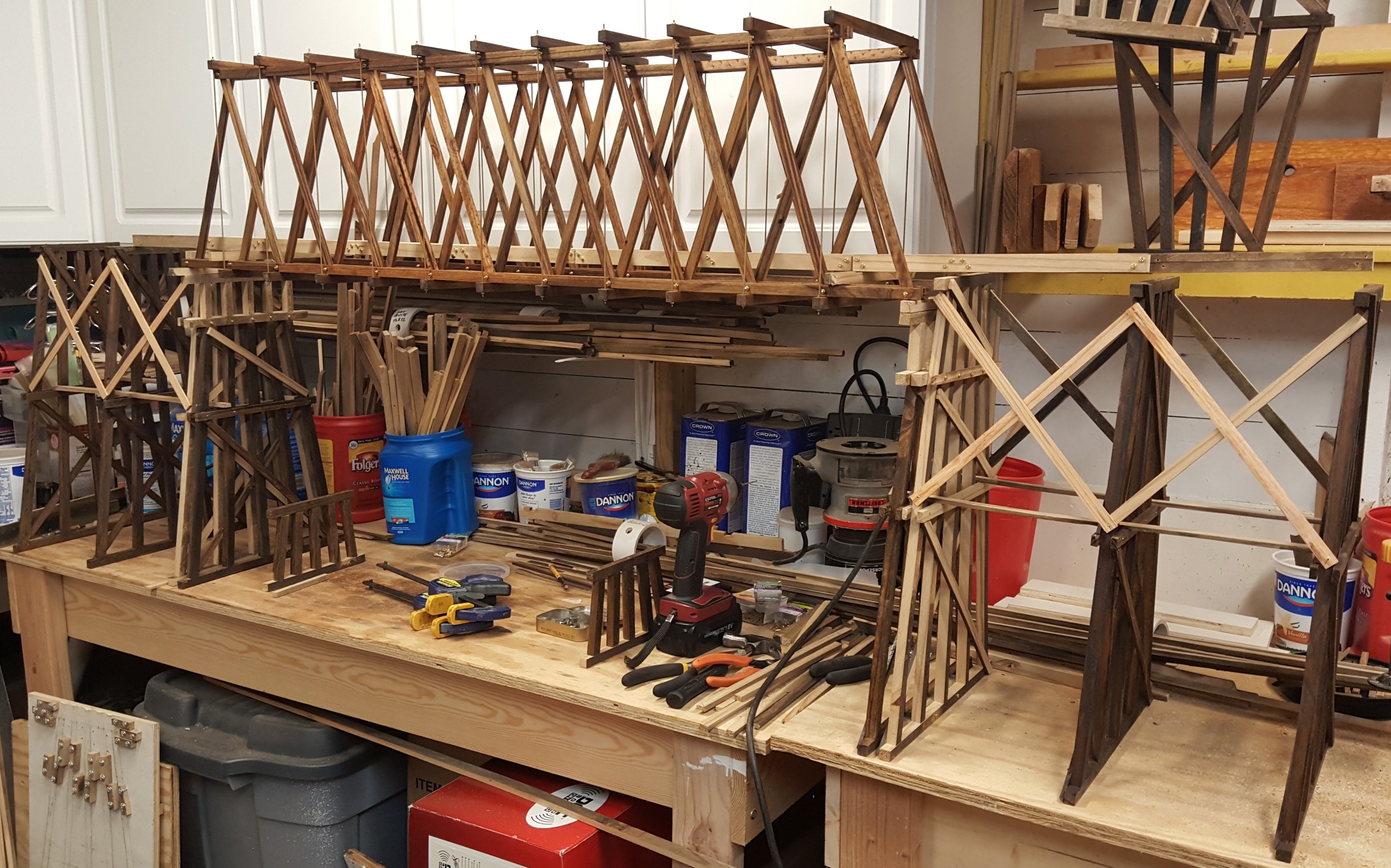 Cranking out piece after piece, they came together into a very realistic looking trestle... That never got used. To add insult to injury, the dogs trampled it to pieces while it got moved here and there and everywhere until it was finally in so many pieces the only thing that made sense was to dismantle it and store the bents and other parts until once again needed.