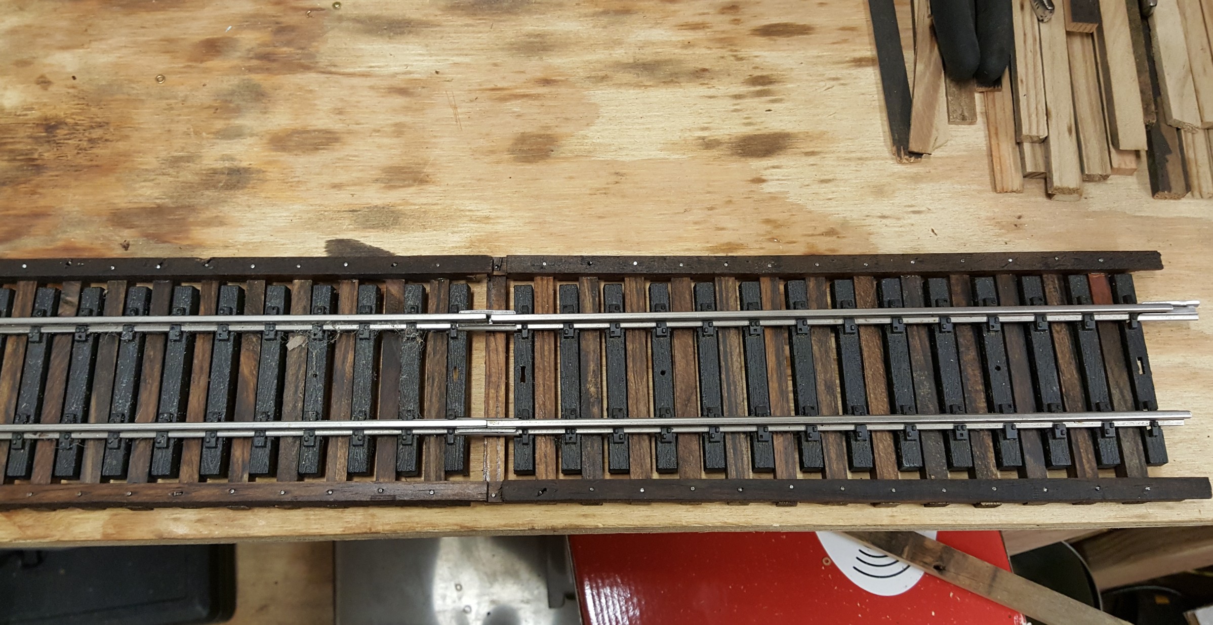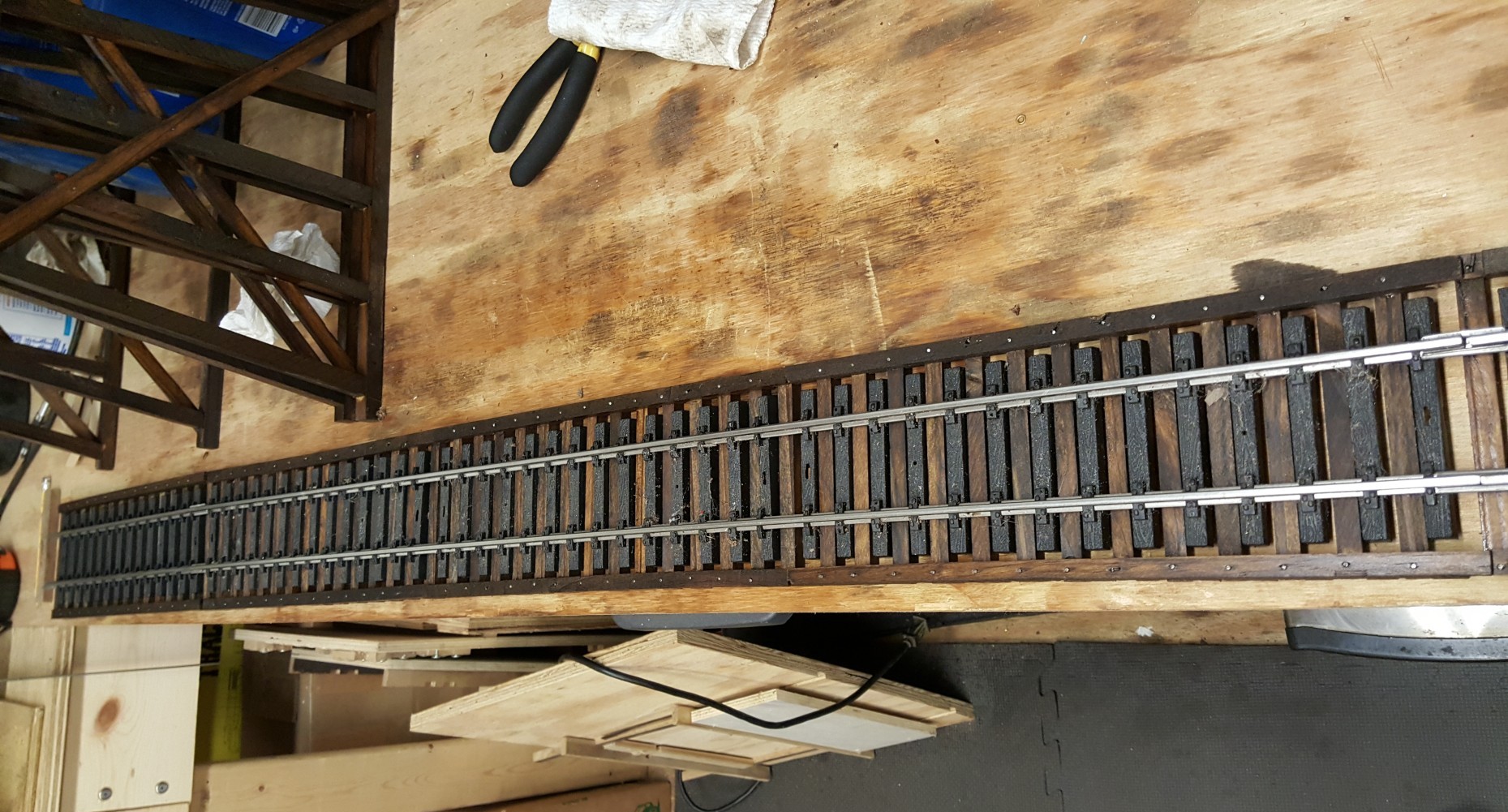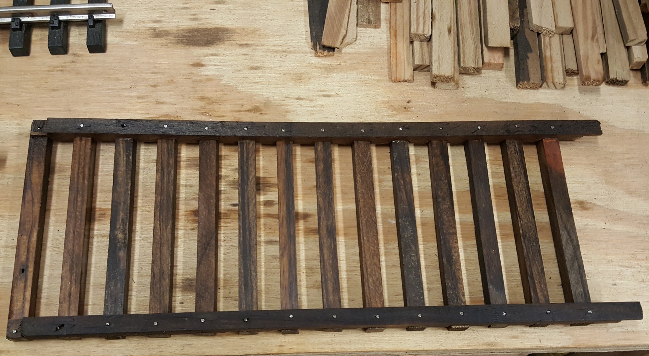 Attention shifts to making the actual track stringers and bridge tie "strips". I have to admit, I got caught up in the "exact replica" modelling mindset. So much so I designed a "slide tray" for the table saw to dado the tie strips to fit the ties! Even the track stringers are assembled in staggered fashion like the prototype. It's a lot of work and painstaking attention to detail in return for prototypical authenticity. And I built a LOT of them.