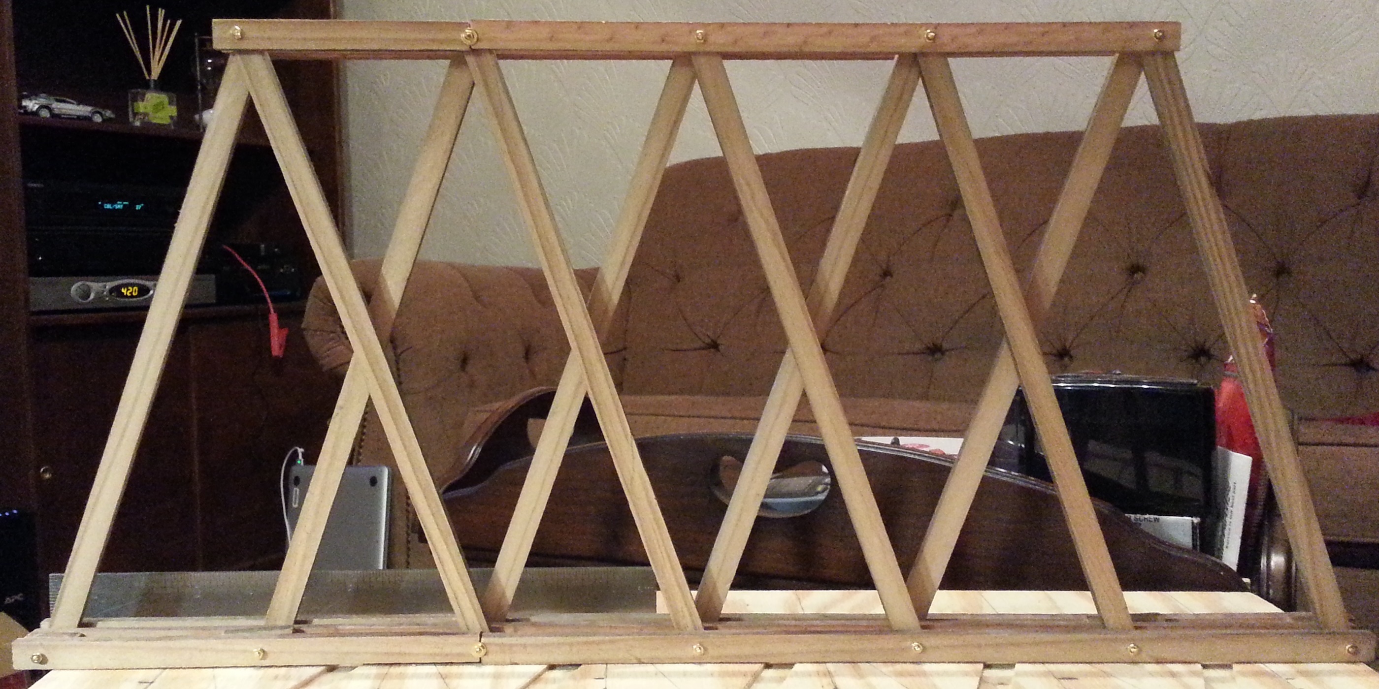 As an aside, this bridge "design" strays from the prototype, using a more practical approach for modelling. The prototype has metal "joiners", or joint plates, essentially pinned metal spacer blocks that keep everything aligned. The members aren't fastened together at a common joint, but rather rely on the vertical tension rods keeping every member of the truss firmly in compression.