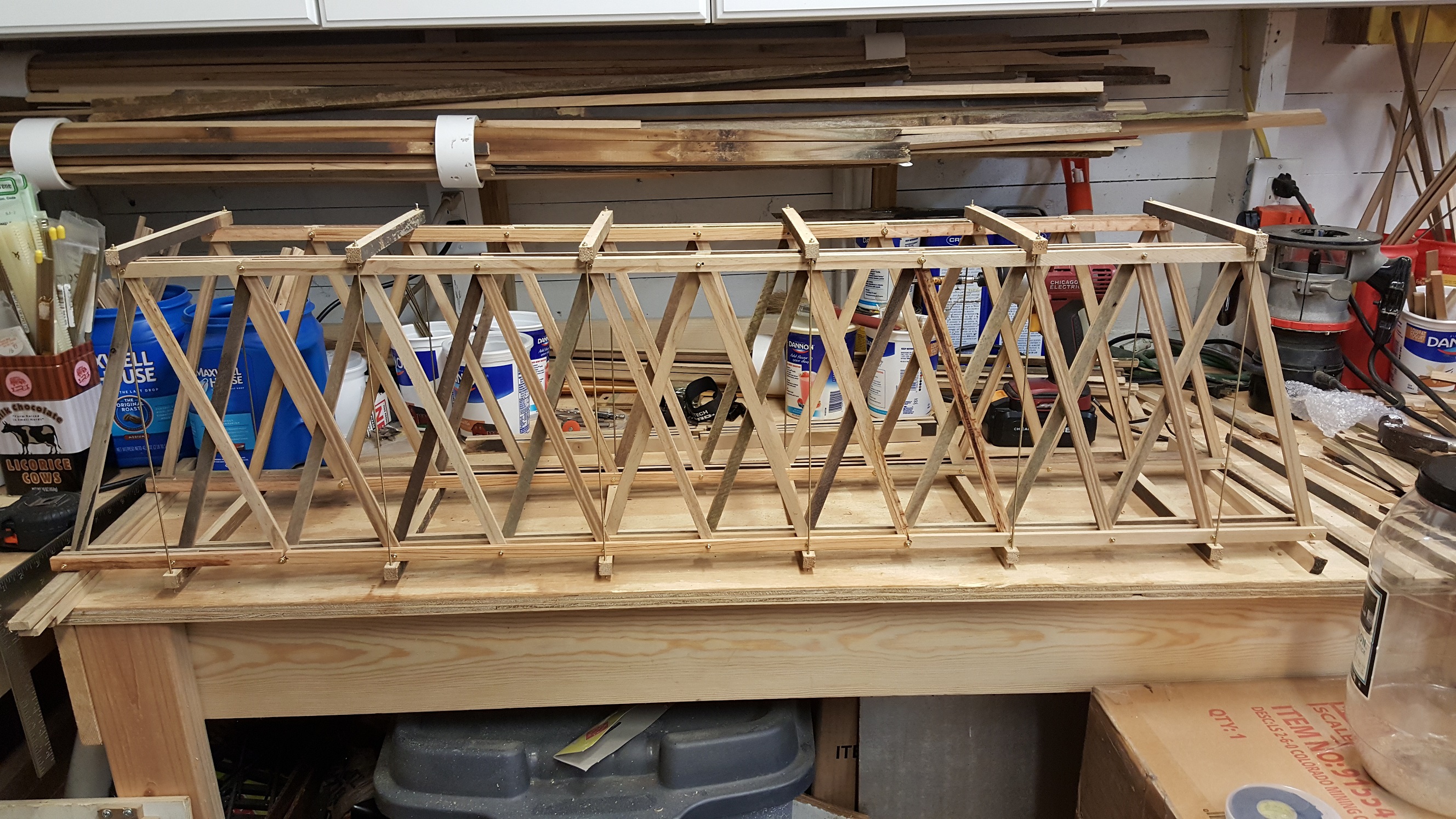 But even the new template fell short when trying to assemble the truss spans. It was only good for the first two layers (out of five). After that, everything was just precariously placed, waiting to be fastened together with the remaining parts. By the end, making the howe truss bridge turned into a major production, including specialized templates for the dremel drill press to make more consistent bores for the fasteners.