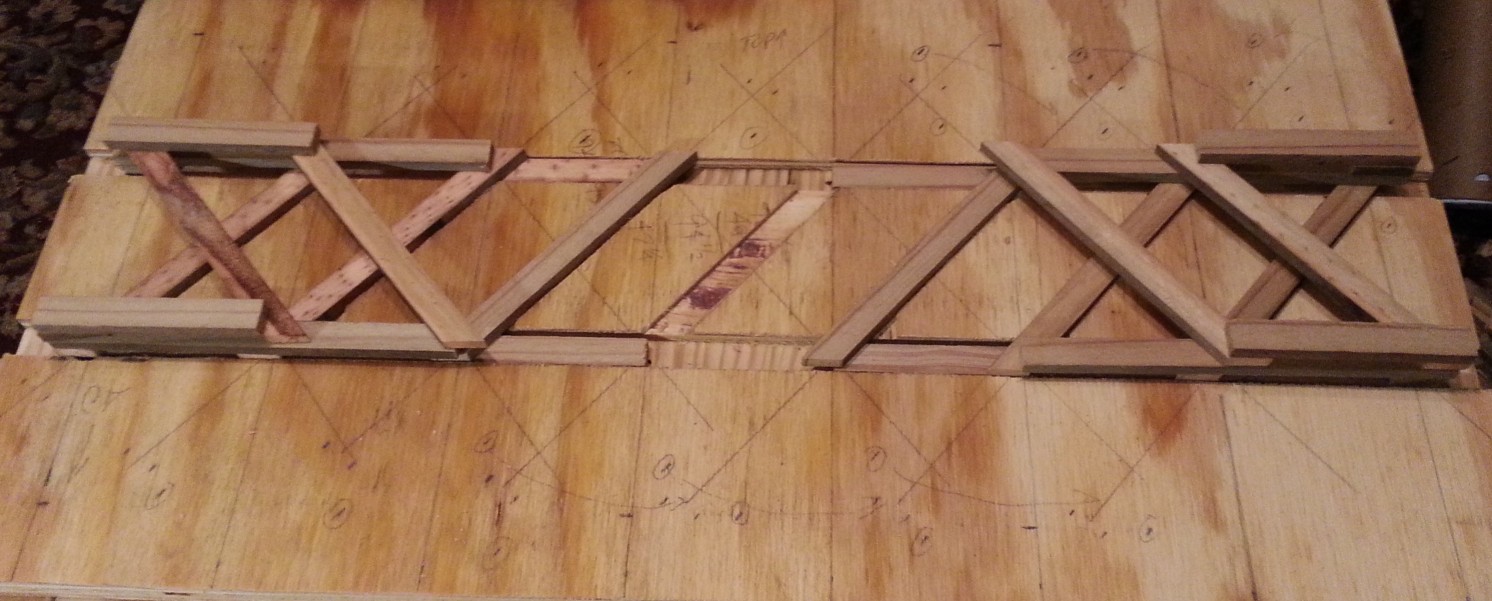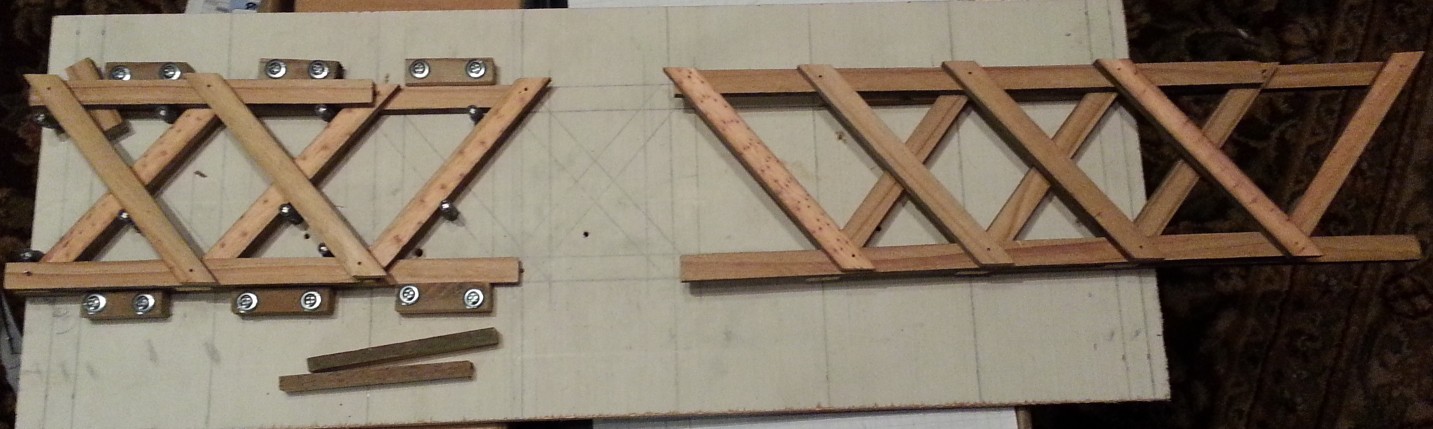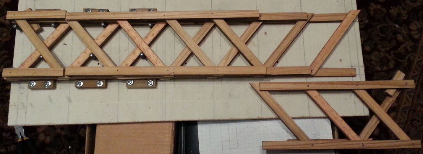That being said, it seems reasonable to use that approach for building our bridge(s). So the way it works is the bridge trusses are assembled in sections. There are two end sections, roughly 6" in length, and a center span of the length required to yield the desired overall length of the bridge in 3" increments. It's difficult to describe, but parts overlap in progressively longer or shorter segments so each section can overlap.