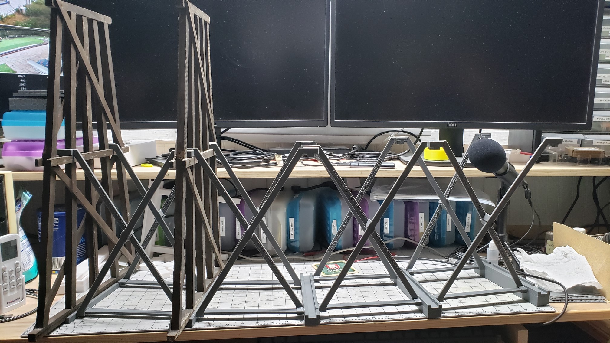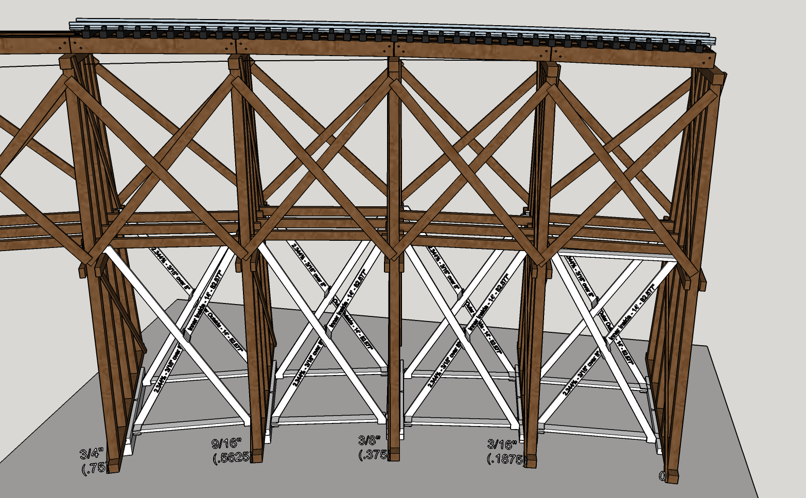 From past experience, just trying to arrange three trestle bents into an approach trestle proved to be a chore, another one of those "need three hands" adventures. Now add the extra complications of arranging them together at an angle to each other for curves and staircasing taller and taller at the same time and it's time for a jig designed to fit the job at hand.