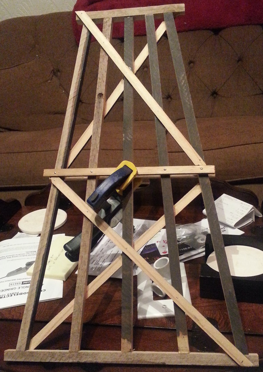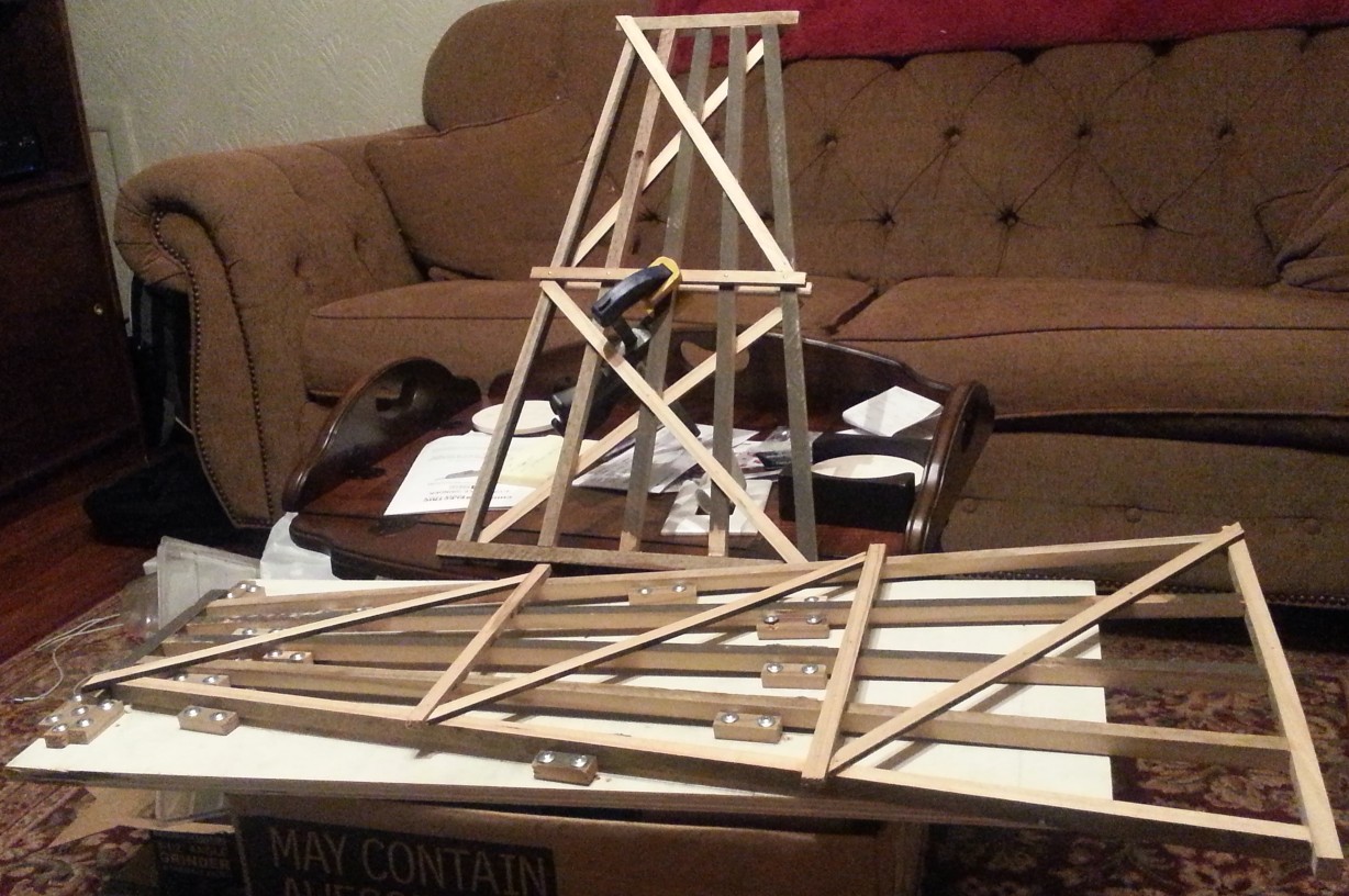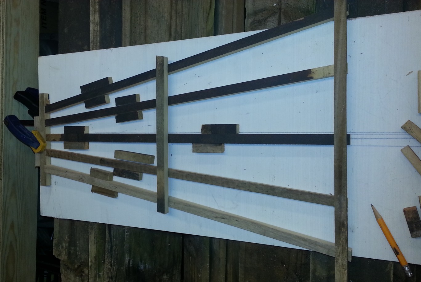 It all started in the living room of our home in Mount Dora, not quite a year after moving here. Using a hastily fashioned "template", if you can even call it that, made from the same ½"x½" stock used for the legs of the trestle bent. After assembling the first few bents, it was readily apparent a different template was necessary. No repeatability, but at least the design works and bents are being built!